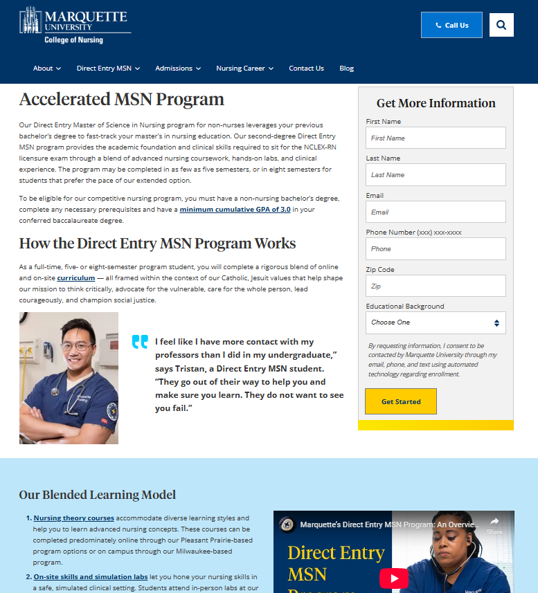 Marquette’s Direct Entry MSN program offers an accelerated pathway to a graduate-level nursing degree with two program locations (one at their main Milwaukee campus) and five-semester or extended eight-semester formats.